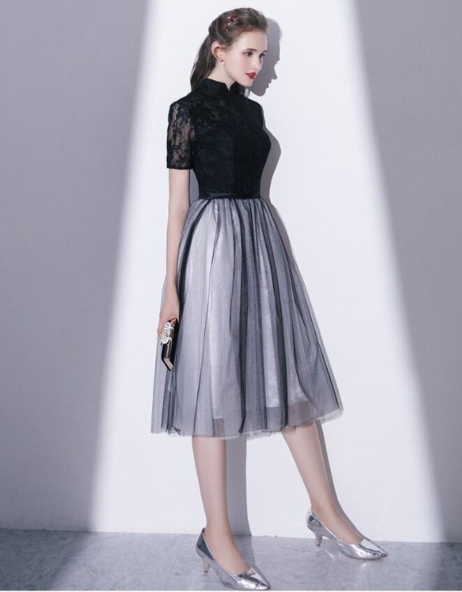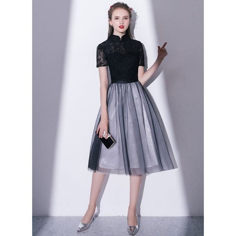 ・パーティー結婚式ドレス バイカラー ドッキング 立て襟 ミディ丈